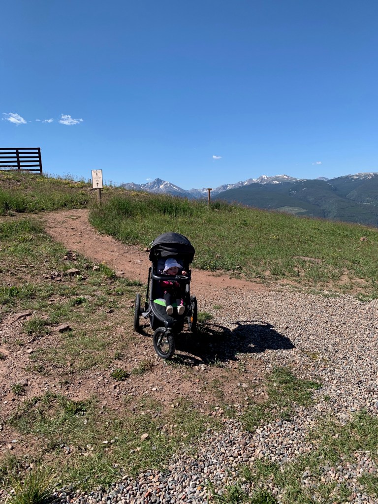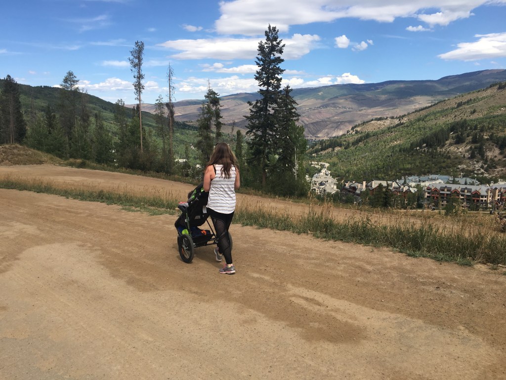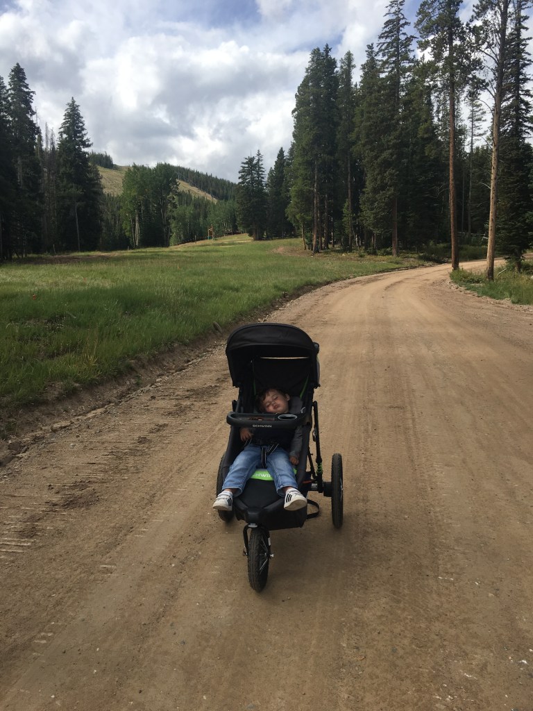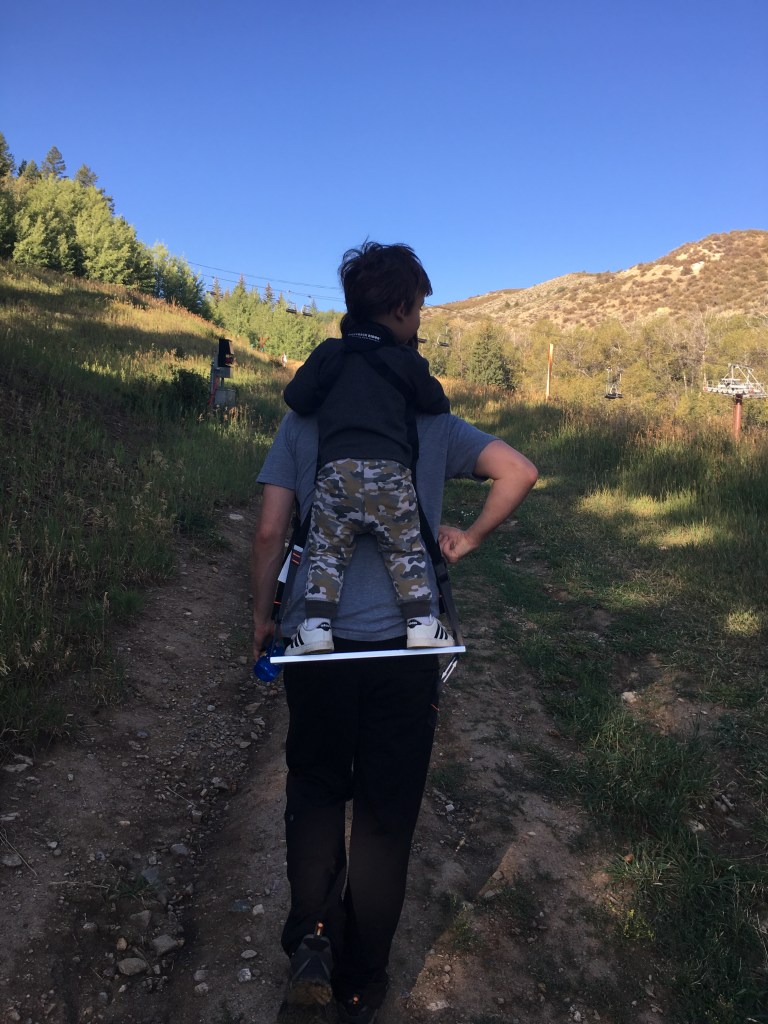 On one of our trips up, we decided to walk down instead of taking the gondola. We did this last summer with just Landen, and he slept for part of it, and it was nice and peaceful and relaxing. This time was a bit trickier with both of them sharing a trailer and no one napping (“hands to yourself baby!” – Landen), but we still had fun. Landen wanted to do some real hiking down some blues (Gold Dust for those of you who know the mountain). I couldn’t walk for a couple of days after.