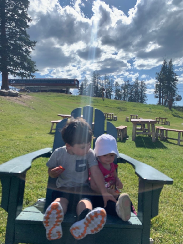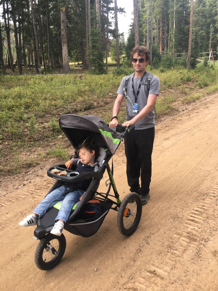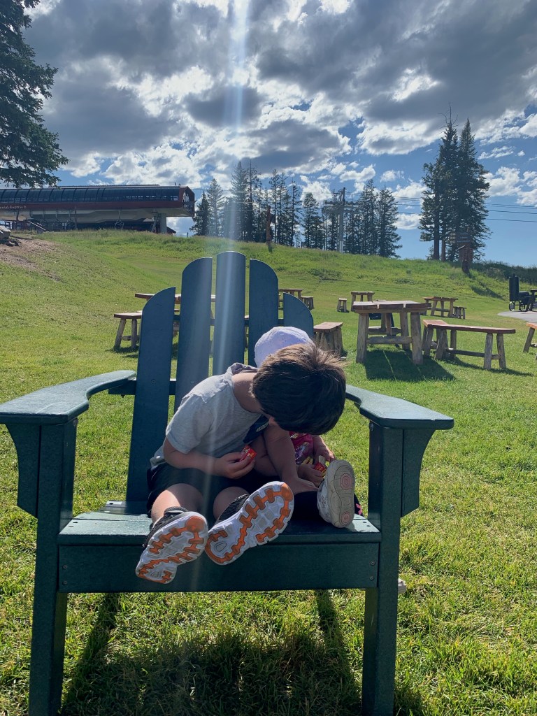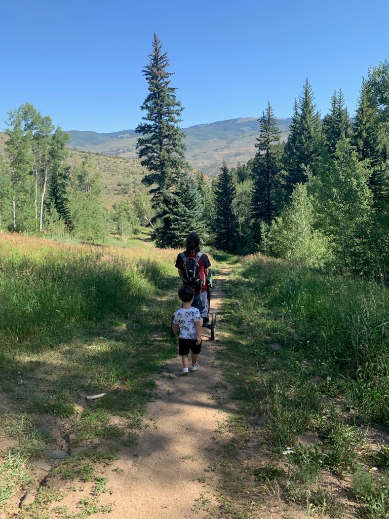 On one of our trips up, we decided to walk down instead of taking the gondola. We did this last summer with just Landen, and he slept for part of it, and it was nice and peaceful and relaxing. This time was a bit trickier with both of them sharing a trailer and no one napping (“hands to yourself baby!” – Landen), but we still had fun. Landen wanted to do some real hiking down some blues (Gold Dust for those of you who know the mountain). I couldn’t walk for a couple of days after.