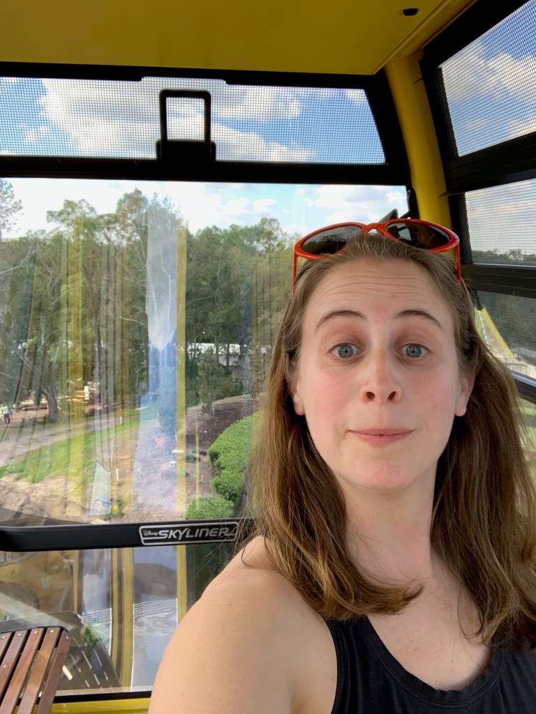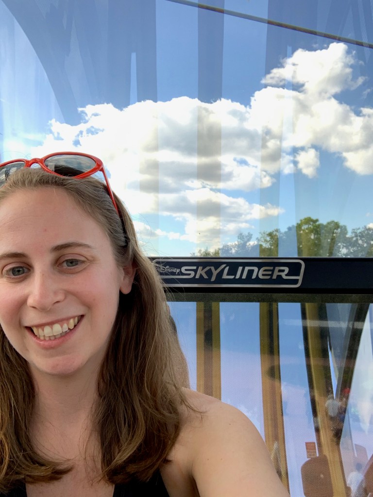Speaking of transportation, Disney resort guests also receive complimentary transportation to and from all of the parks and Disney Springs. Prefer not to take the bus? That’s fine, you can drive, because parking at the parks is free for Disney guests. (Note: Hotel parking is NOT free, so don’t let this perk make or break your decision to rent a car.) Also, many off site hotels will provide bus service to the parks, but you will not get the convenience of the boats, monorail, or the brand new skyliner off site, all quicker and easier than shuttle busses. I don’t have pictures of boats or buses because those are not new or exciting, so I didn’t think about it, or the monorail because I didn’t ride it this trip, but here’s the new skyliner! People are scared of this mode of transportation, but let me remind you that Disney did not reinvent the wheel here. This is a ski gondola, with the only difference being the lack of space for skis and snowboards on the outside. It is perfectly safe AND the quickest, easiest way around.