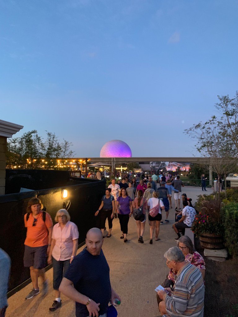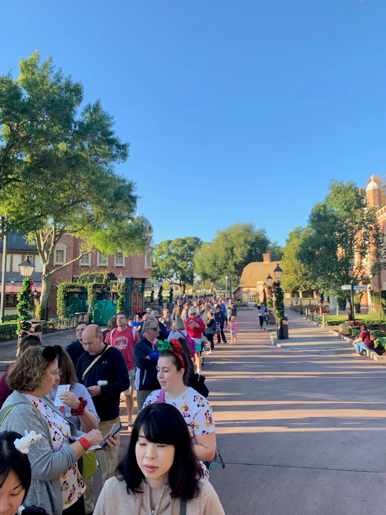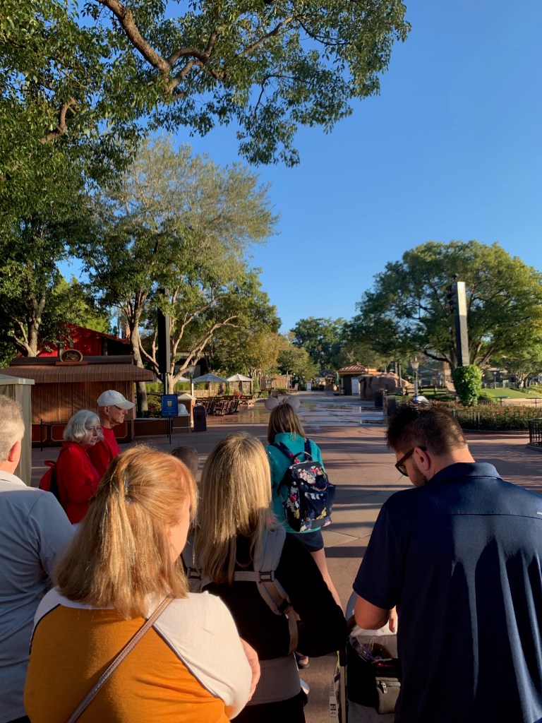 Anyway, we walked to the International Gateway entrance to Epcot from our hotel and we were there about 30 minutes before opening. They started scanning people in right around this time and we were among the first in line at the “rope” before opening. (It was an Extra Magic Hours day, so they were only scanning resort guests or those with dining reservations). Disney lets you into the park before opening to start the scanning process, but they block you off from getting to any attractions until actual opening time. So if you want to be the first on line for a ride, get there BEFORE opening not AT opening.