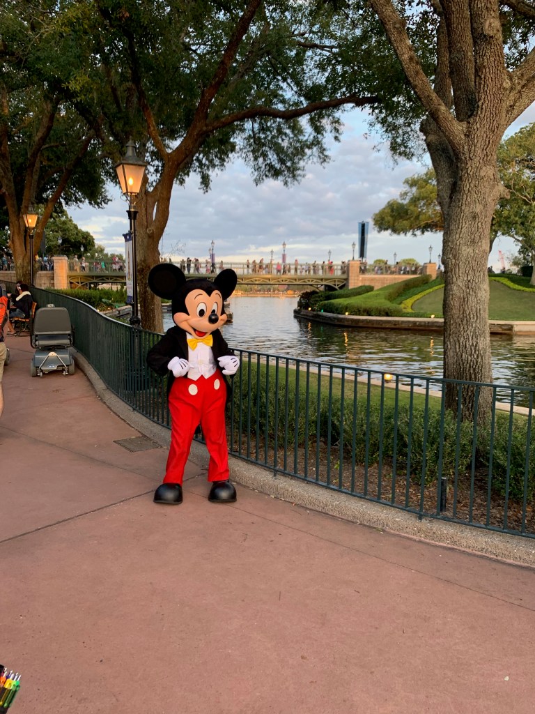 On my way back, I also decided to just hop back into Epcot and have some more snacks. Dinner was late, we had snack credits to use, and it was the final night of the food and wine festival. Oh, and Mickey was there.