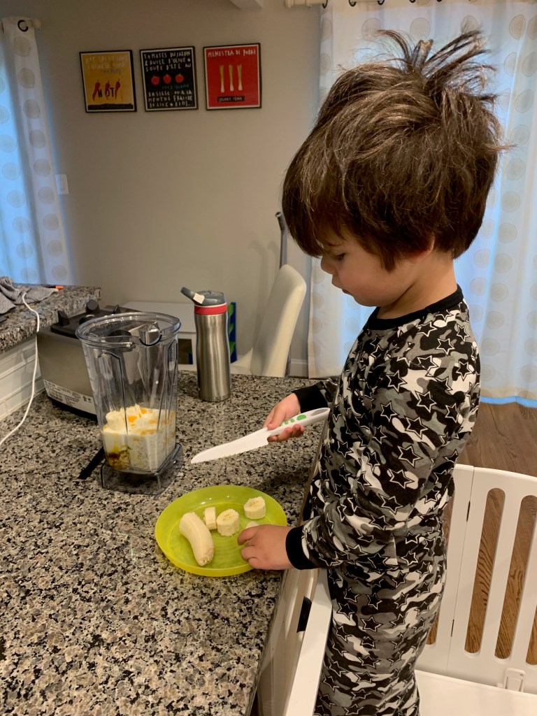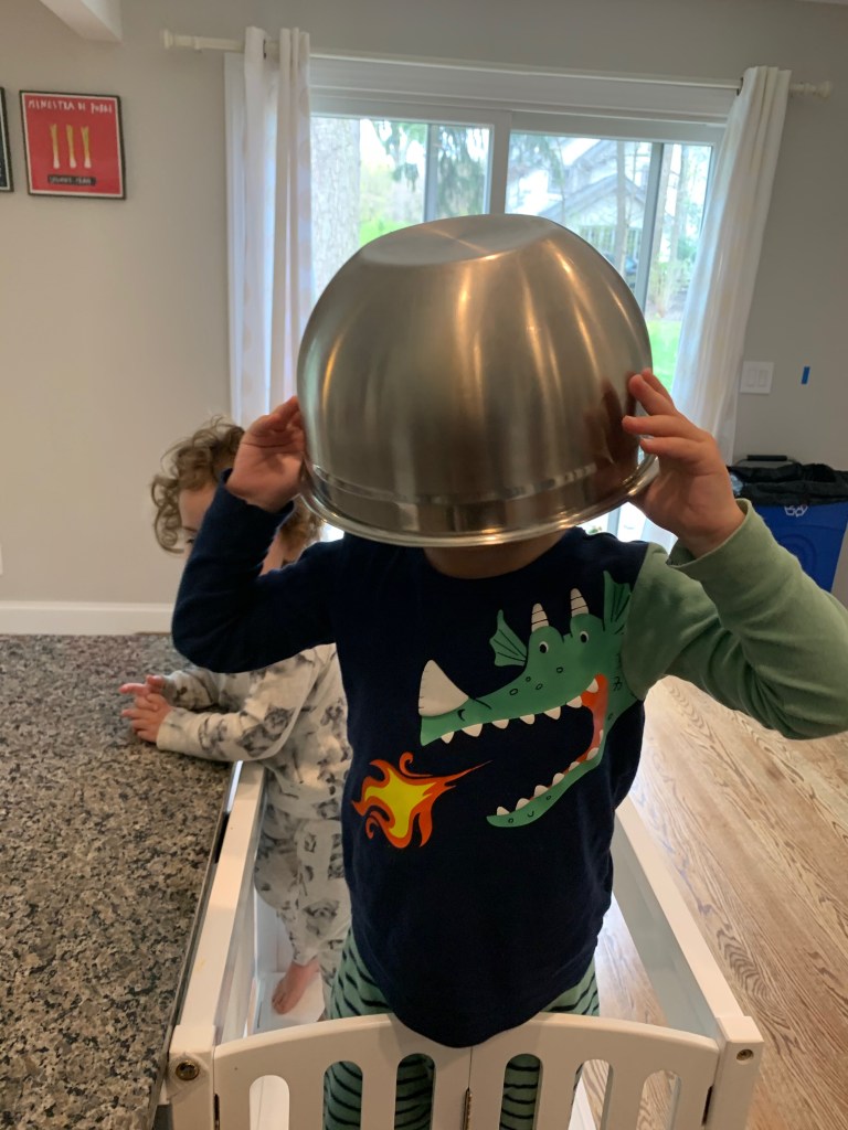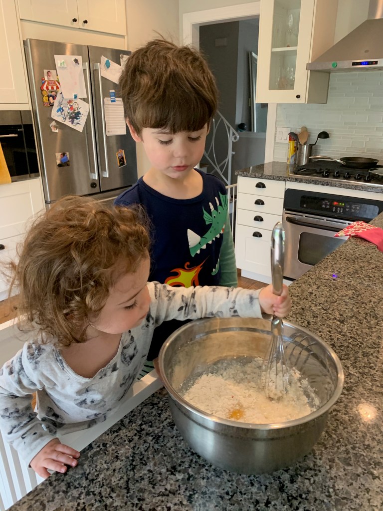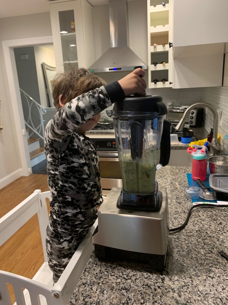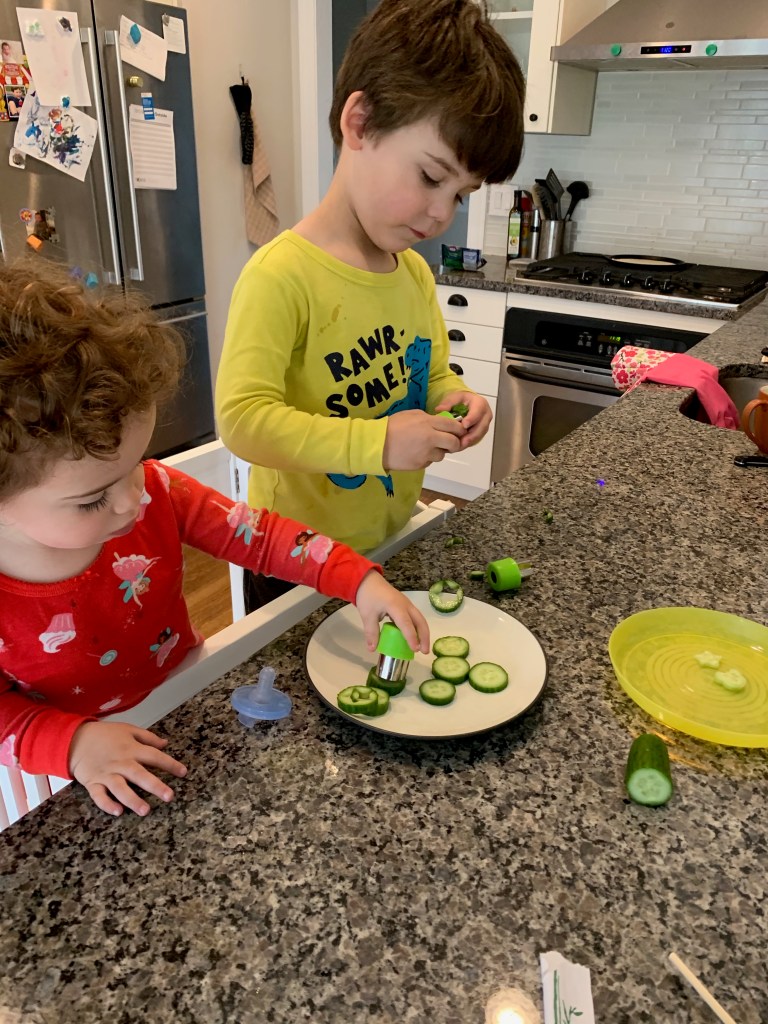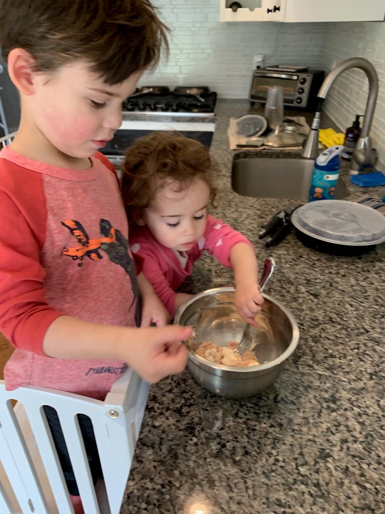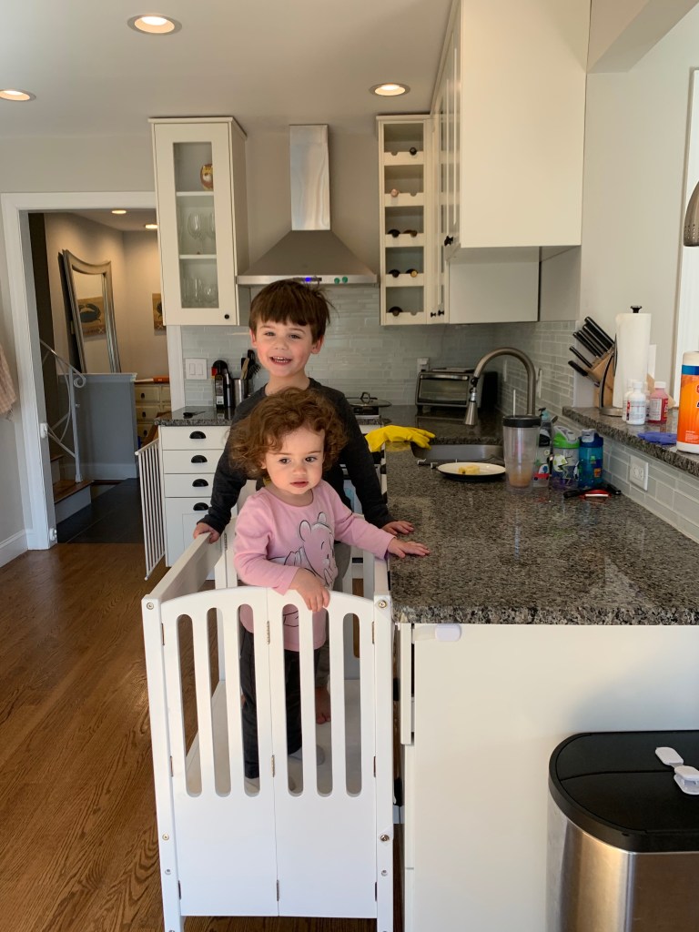 - And for myself, I actually learned to enjoy cooking a little bit more. Don’t get too excited. I don’t love it, but I find it easier to throw some things together and make a healthy meal with less stress. Being home all the time gave me more time to cook. Rather than being out with kids or myself while a babysitter was here until dinner time, we were home. All the time. So I was able to prep and cook more during the day with a little less stress about timing. Oh, and they liked cooking with me too with their brand new cooking stool.