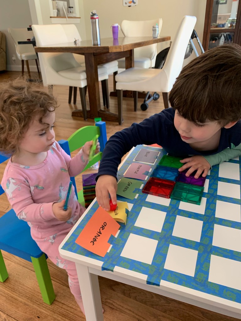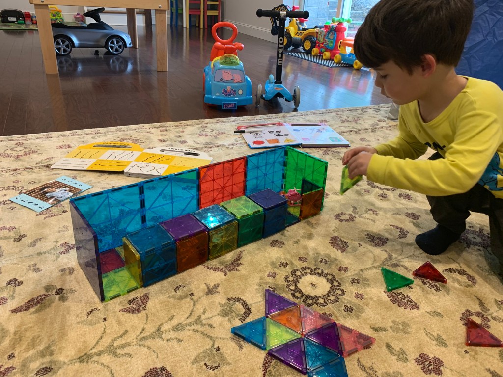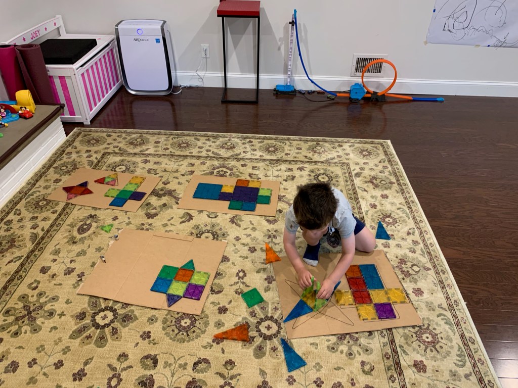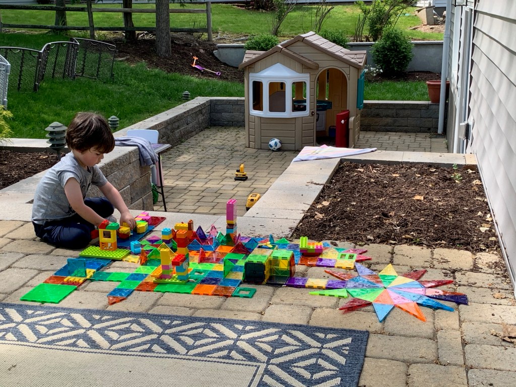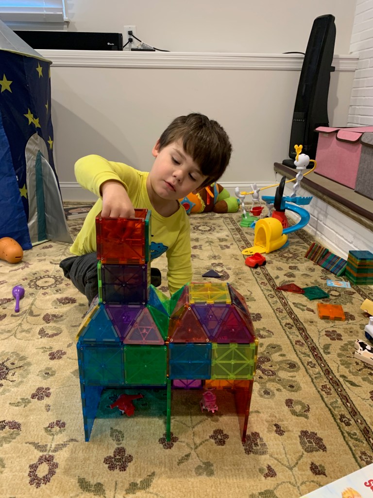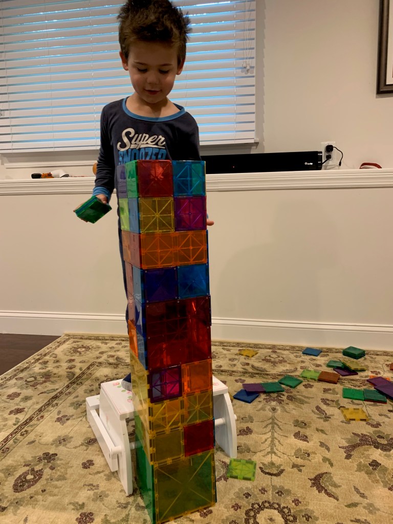 - Landen learned to play independently. This was HUGE. Since the day he was born he was the kid who would scream the second he was left in a room by himself. Playpens did not work. He just clawed at them and screamed louder. He was never a huge fan of ANY toys and he always just wanted to be entertained by adults. Even when he’s watching TV he wants to sit on someone’s lap. It’s exhausting and just super draining. Don’t get me wrong, he still has a LONG way to go and still frequently says “I don’t want to be alone” or “I need a grown up to play with me”, or my favorite “can Joey take care of me if you can’t?” and yesterday he asked me to move my chair to the head of the table with his so I could be closer to him, because sitting next to me but around the corners of the table wasn’t sufficient. But he spent many hours during this time just building quietly with magnetic tiles or creating his own imaginary world (usually based on whatever his favorite show of the minute was). Joey actually always had an innate ability to play by herself, and I actually think it got a little worse for her during this time, but still not so bad and probably mostly just developmental.