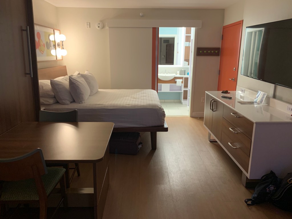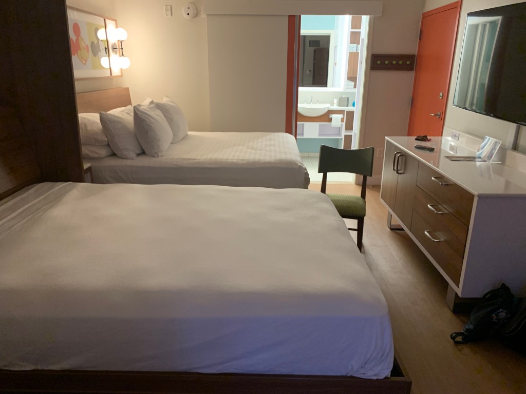 I also really liked the layout of the room itself. When I’ve quoted Pop in the past for clients, it’s always come with the following disclaimer: There is only one real bed in the room, so it may be great for two people but a little uncomfortable for 3 or 4. I have to admit that I was wildly misinformed on this. The second bed, which is listed as a “table bed” or a “pull down bed” actually has the EXACT same mattress as the “main” bed, and having slept in the main bed I can say with confidence that these beds are very comfortable. SO much better than a pullout couch. It is a pulldown table bed because, obviously, you pull it down from the wall like a murphy bed, but when it’s up it is a table with two chairs. It is such a nice way to create more space in the room for a family, and the table is a great addition to add some sitting room. It’s also really easy to pull the bed down for sleep and put it back up to have space when you’re awake. Text me for a vide of this in action. Seriously, I cannot say enough good things about this room.