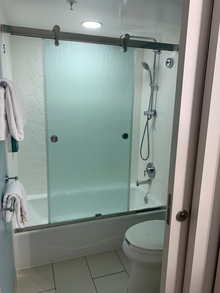 I am happy to say that I very quickly fell in love with this resort. The room was just as nice if not nicer than the rooms I stayed in at Yacht Club (Deluxe) and Port Orleans: Riverside (Moderate). Many of the Value Resorts, Pop Included, have been recently updated, and it shows. And I must mention the shower doors. Every single other room that I saw on this trip (11 resorts total, at all three price points, but most of the actual rooms I saw were in Deluxe resorts) had shower curtains. But not Pop. Pop had beautiful glass doors, and having just designed my own bathrooms for our house renovation I can tell you these were not even the bottom of the line basic doors. They were really nice sliding doors. This is a huge plus for me. Also, there is a sliding door between the sink area and the toilet/shower area so more than one person can be using the bathroom at the same time.