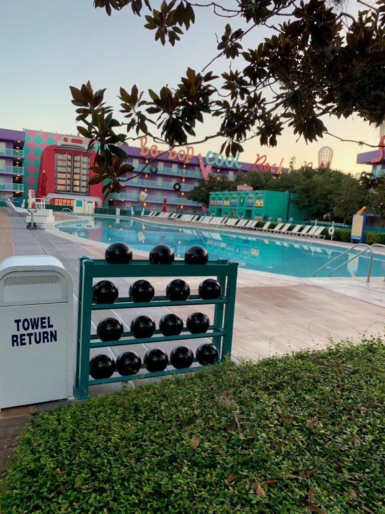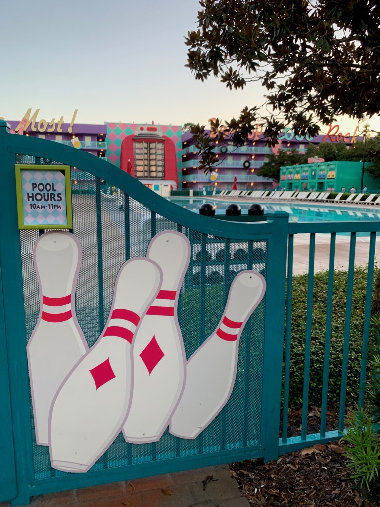There are two smaller pools, the bowling pool in the 50s section shaped like a giant bowling pin, and the computer pool in the 80s/90s section. Check out some of the detailing in the decor at these pools. Disney clearly knows what they’re doing.
