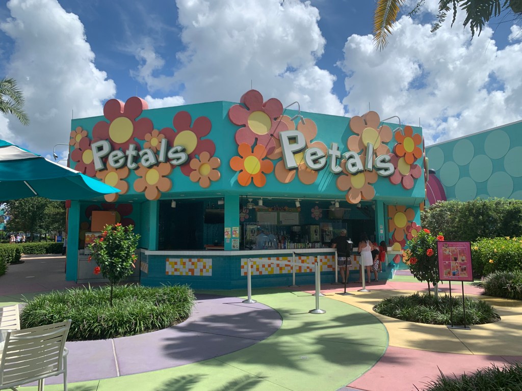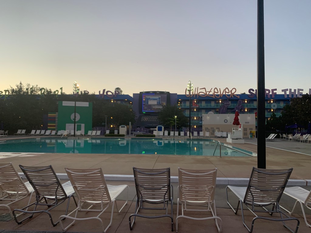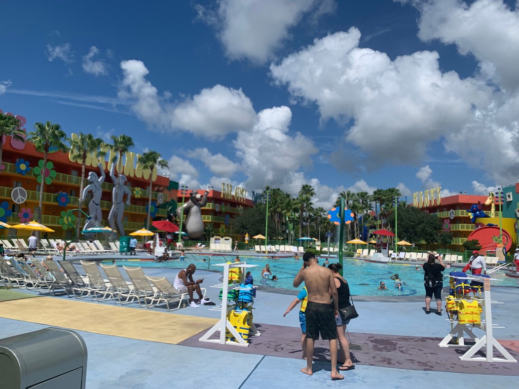 This is fun for kids because, Disney, so it’s all of course very bright, colorful, and over the top. There are three pools – the Hippy Dippy Pool in the 60s section of the resort is considered the main pool. It’s shaped like a giant flower with flower shaped water jets (because, Flower Power, duh). There is also a kiddie area with pop jet water fountains close by and a snack bar.