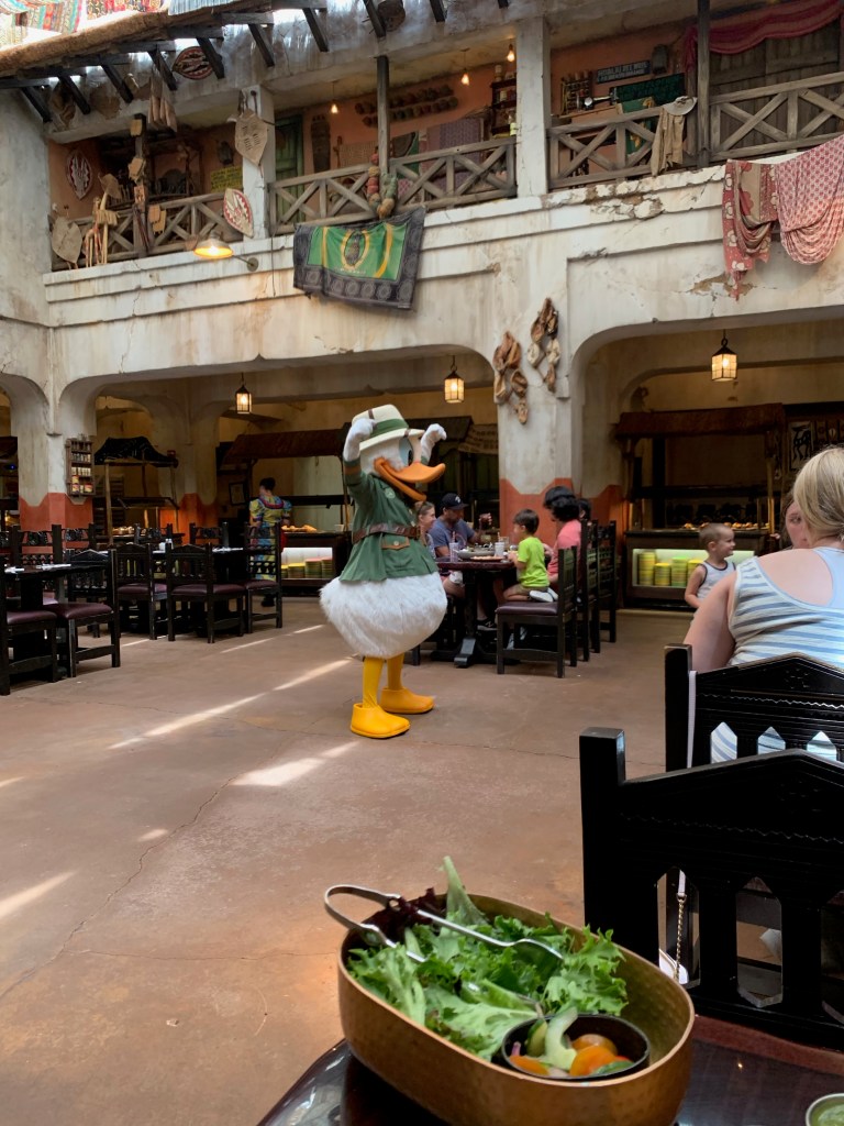 On my most recent trip to Disney World, before the scheduled agency events began I decided to take myself on a date to Tusker House in Animal Kingdom. Tusker House, located in the Africa section of Animal Kingdom near the Safari, is modeled after a Harambe themed marketplace, serving African spiced proteins and sides. It is a character meal where you get to see Donald Duck and some of his friends (Mickey, Daisy, Goofy) dressed for the Safari!