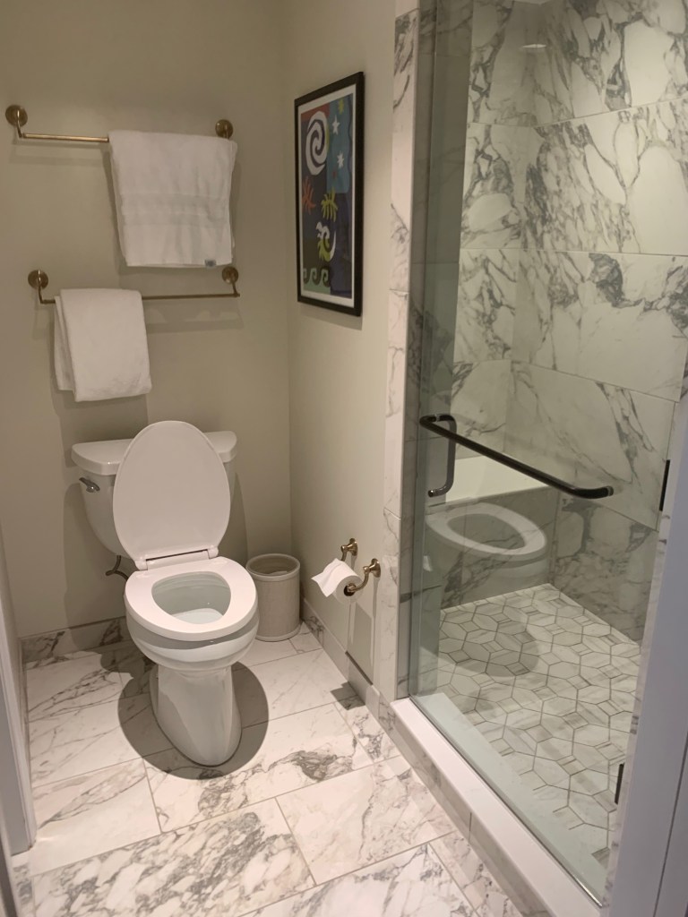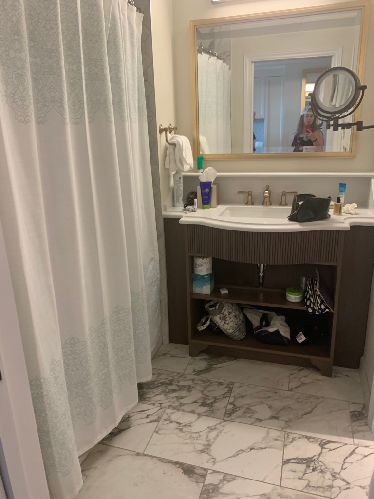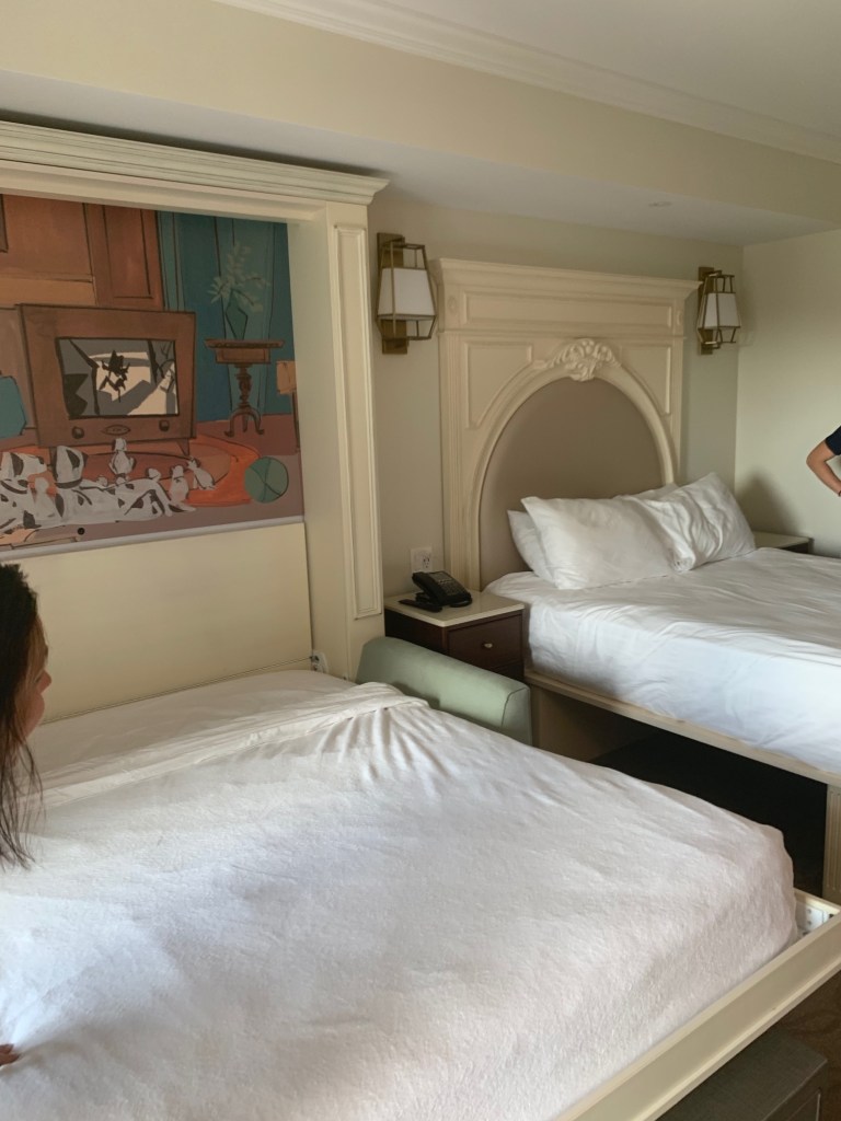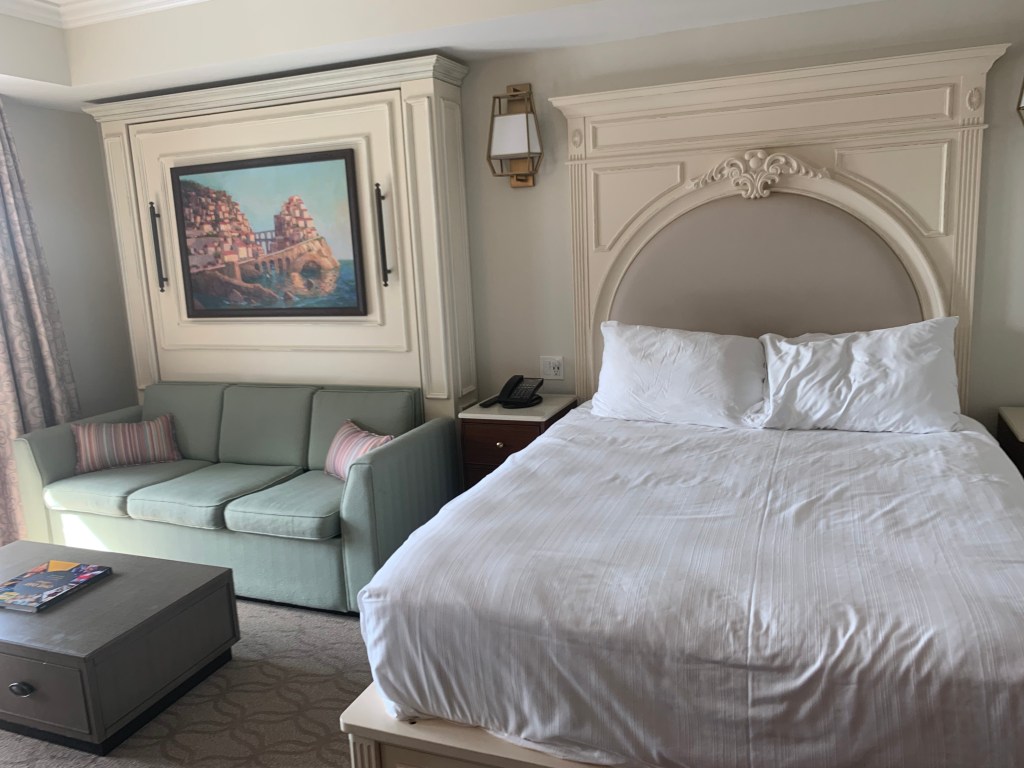 The Riviera is the newest resort on property, and who doesn’t love a good new resort feel? The rooms are, obviously, the most updated. It is also a DVC (Disney Vacation Club) hotel, which means it is an all suite hotel making it possible for larger families to stay here as well. I have three kids, and there are many rooms that are not equipped to sleep more than 4, so these suite options are helpful. The deluxe studios, which would be more comparable to a standard room, also have a pulldown queen bed and a pulldown twin bed making the room more spacious when the beds are up, and a split bath with two showers.
