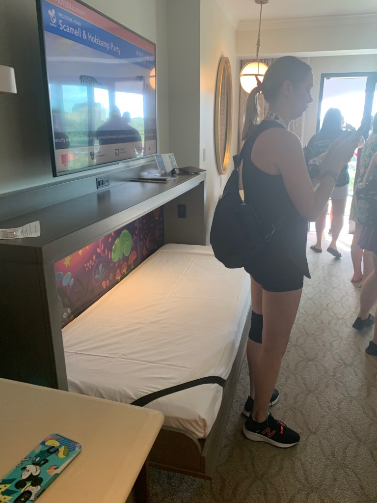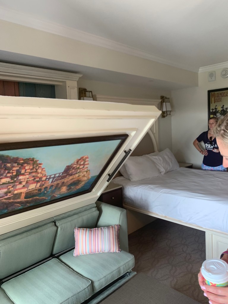 The two shower situation is pretty amazing. And as for the pulldown bed, before I stayed in a room like this I was skeptical. However, as you may remember from my Pop Century stay this summer, the pulldown bed is the same mattress as the regular bed, it just goes into the wall for more space. This is WAY better than a pullout couch. Good job Disney.