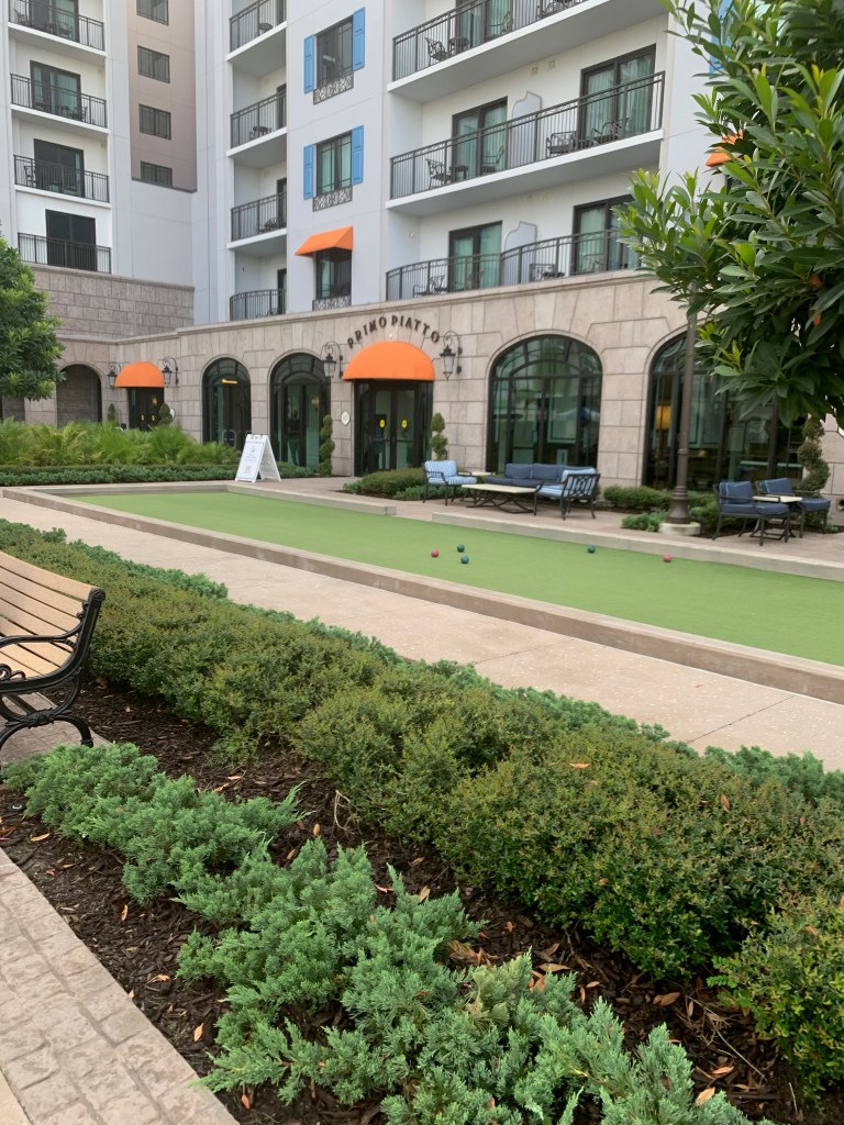 The grounds are beautiful and as you walk around you’ll find gardens and fountains that make you feel like you’re in Europe, as well as a chess set and bocce ball court for your entertainment and a Mediterranean themed pool with a kids splash pad.